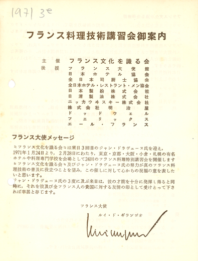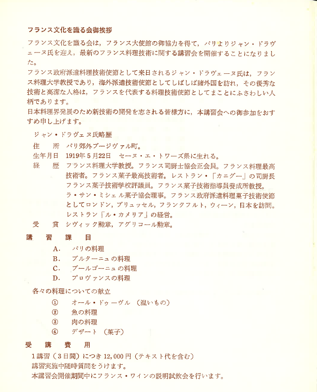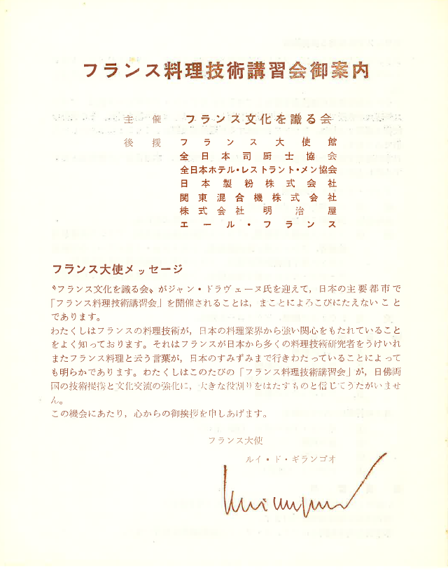 日本のプロのフランス料理キュジニエの皆様のために、日本で初めてフランスからフランス人シェフを招聘して講習会を開催したのは1969年。日本のフランス料理業界が大きく花開きかける直前でした。