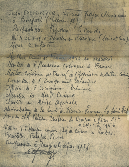 この画像はドラヴェーヌ氏直筆のご本人の略歴です。料理人としてとても有名なドラヴェーヌ氏ですが、M.O.F.(フランス国家最優秀職人章)は料理部門ではなく、パティシエ部門。