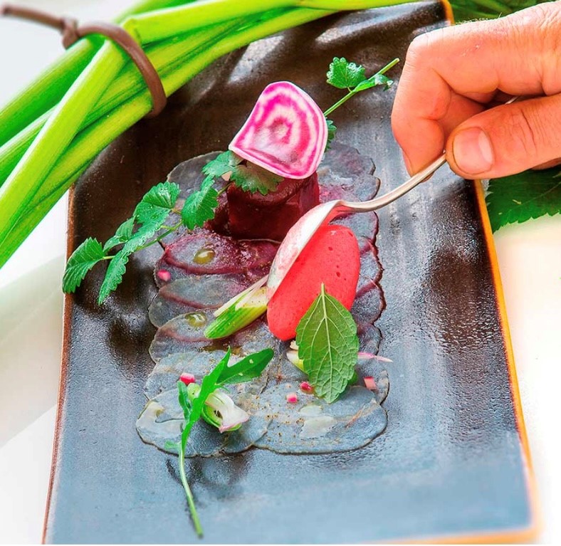 アンコウは塩やスパイスで漬けてから、ショウガや柑橘系の香りをプラスしたオリーヴオイルでマリネしています。ビーツのソルベを添え、薄くスライスしたキオッジャ(渦巻きビーツ)がこの料理に華を添えています。 レストランでは、同じくブルターニュ半島・アルゾンより西側に位置するコンカルノーで獲れたアンコウとシェフの庭で採れたビーツを使用しているそうです。