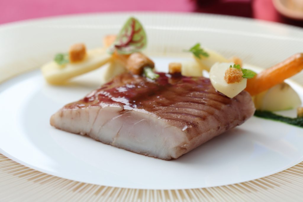 ブルゴーニュ地方の赤ワイン・ジュブレ・シャンベルタンをたっぷり使用した魚料理です。「フランスであればヒラメを使うけど、日本だからマツカワカレイにしましたよ。」と、日本の食材をよく知っているオージエシェフ。