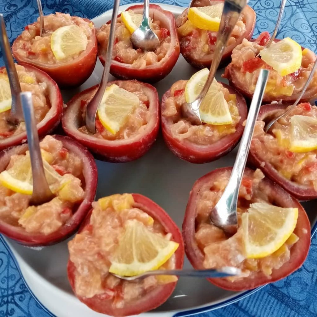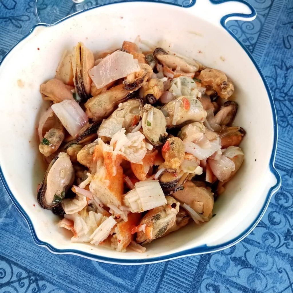 これは、fruits de mer(貝2種、ムール、イカ)とsurimi(スリミ、日本ではカニカマのことですね!)、みじん切りしたéchalote(エシャロット)、persil(パセリ)をvinaigre(白ワインヴィネガー)、huile d’olive(オリーブオイル)、sel et poivre(塩、コショウ)でマリネしたもの。fruits de merはマルシェで購入して、persilはお庭で採れたものとのこと。マルシェで新鮮な魚介類が気軽に購入できるのもフランスならでは。