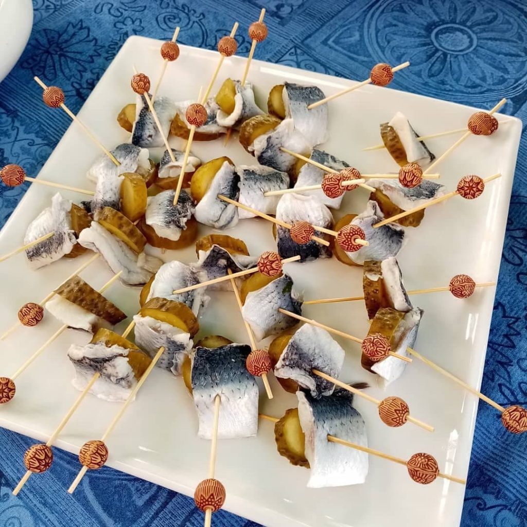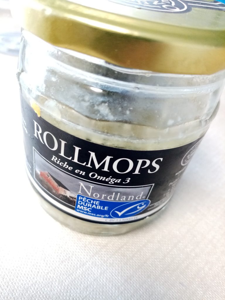 Rollmops(ロールモップス)といって、hareng(ニシン)の酢漬けにcornichon(ピクルス)を巻いたもの。こちらは串に刺しただけで簡単に。Rollmopsはスーパーで下の写真のような瓶詰が売られているそうです。