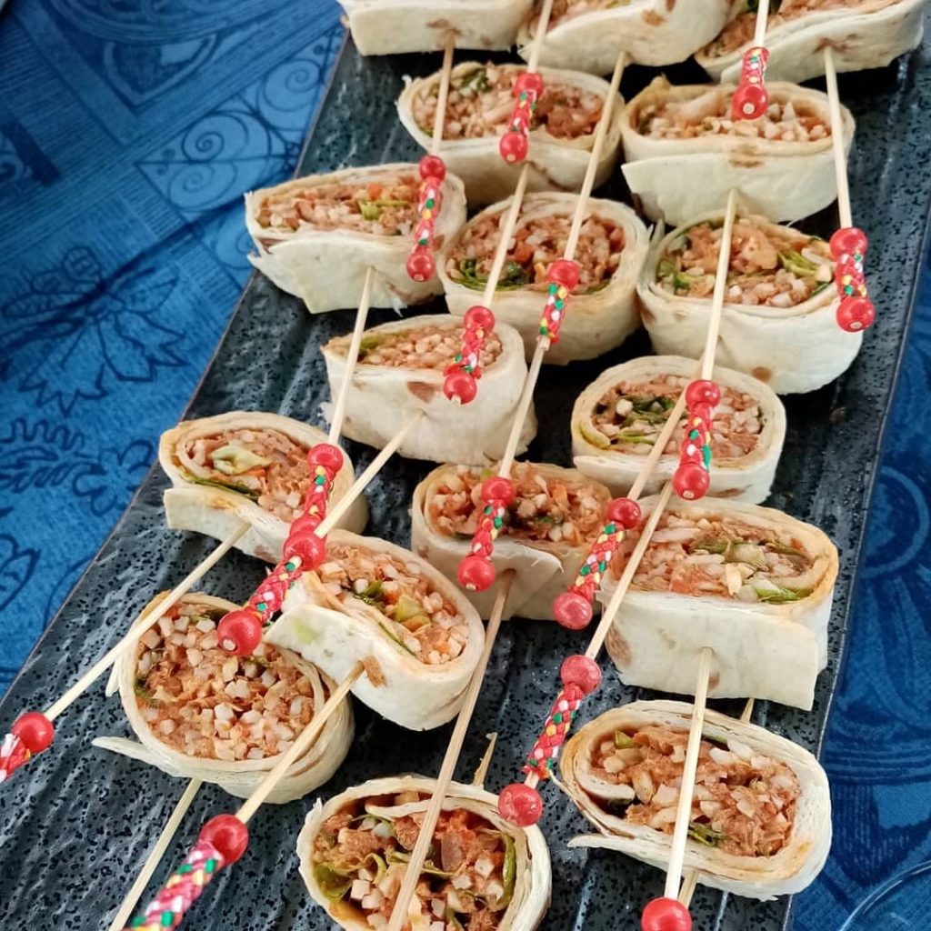 Wraps(ラップサンド)。中身はthon(マグロ)の缶詰、mayonnaise(マヨネーズ)、laitue(レタス)、échalote(エシャロット)。串に刺して食べやすく。串の持ち手がこんなにかわいいと気分も上がりますね。