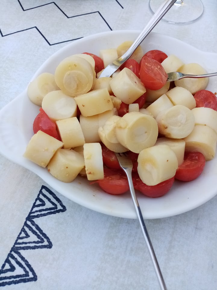 Petites tomates(プチトマト)半分に切り、それと大体サイズを合わせてCœur de Palmier (クール・ド・パルミエ、ヤシの芽の内側の部分から摂れる野菜の瓶詰)を一口サイズに切り、お好みのドレッシングで15分ほど軽くマリネします。この日のドレッシングは、粒マスタード、オリーブオイル、醤油、ヴィネガーだったそうです。Cœur de Palmierは日本でも輸入食材を扱っているお店で買えますよ。