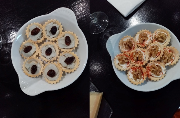 Tartellete(タルトレット)。スーパーで購入したTartelleteに、左がcrème de fromage au Bleu(ブルーチーズクリームチーズ)+raisin sec(レーズン)。右がcrème de fromage(クリームチーズ)+noix(クルミ)+上からPiment d’Esplette(ピマン・デスペレット)。crème de fromage au Bleuも日本では見かけませんが、ブルーチーズとクリームチーズを合わせれば作れそうですね。