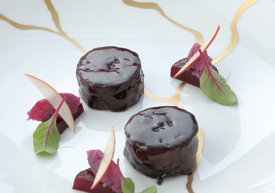 palets de betterave dans une mélasse et compotée de chou rouge aux pommes