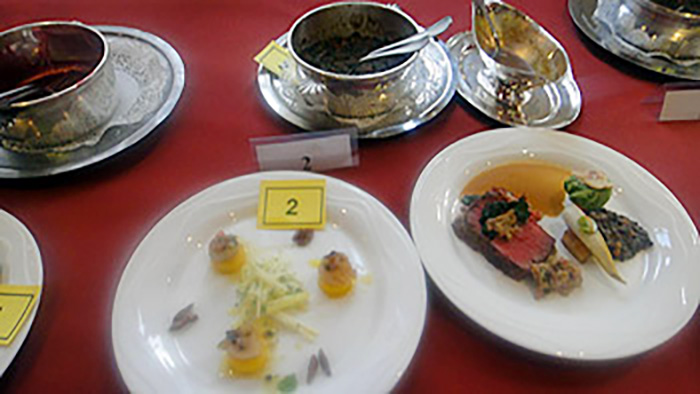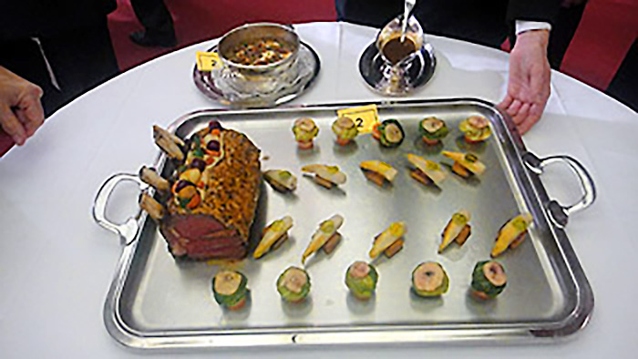風味の弱いラプローの味を引き立てるファルス、強すぎるとそのファルスの料理になってしまい主客転倒、また、2羽で8人分となると1人分の量が多く飽きないで一皿食べるには、皿の中のハーモニーが1番の問題だったと思う。決勝に残ったシェフたちの料理は、それらをクリアした素晴らしい料理で、日本のレベルの高さを感じた。