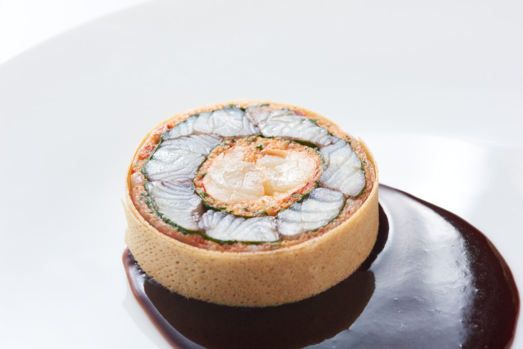 ガルニチュールにはポムドフィノワーズやアンドゥイユなど古典的なフランス料理や、牡蠣やそば粉といったブルターニュ地方の食材に,柚子胡椒やシイタケなど大分を代表する味を組み合わせ、一つの皿の上に仕上げました。