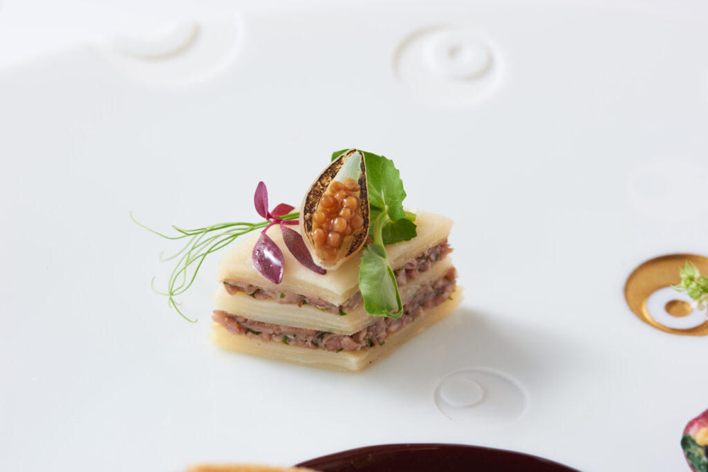 ⑤ ポムドフィノワーズとアンドゥイユを交互に重ねよくプレスし、切り分ける。無量塔のマスタードを詰めたパールオニオン、ピーテンドリル、マイクロアマランサスを上に飾る。