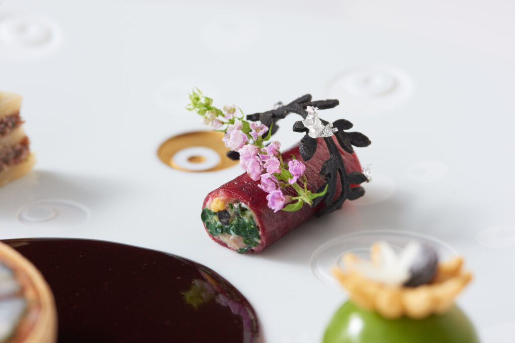 ② 玉ねぎ、ベーコンを無塩バターでスエし、ほうれん草を加える。薄力粉、コーンスターチ、牛乳でとろみをつけ、サンポーラン、タミゼした卵黄、卵白、粒生胡椒を混ぜ合わせる。ビーツで巻き4cmに切る。