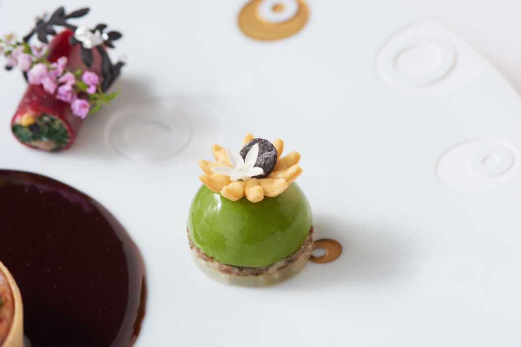 ⑦ フラン、デュクセル、セロリラブを重ね、パートブリゼ、黒トリュフ、エディブルフラワー(白)を飾る。