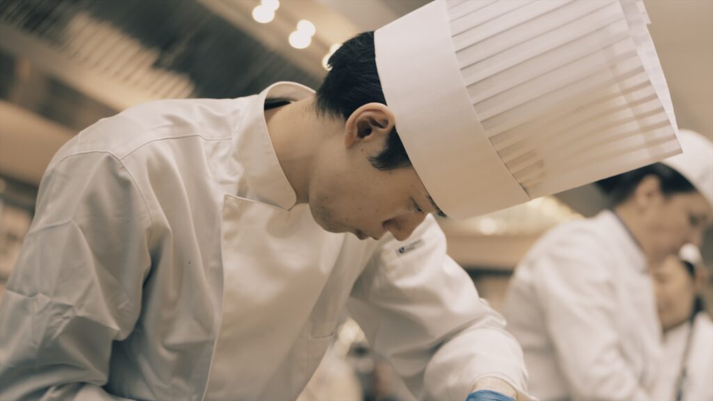 今大会は、各国予選で書類選考として出題された「リュ・ジョーヌとオマールエビ2尾のアシエット料理」と、本選の前日に発表された「シューのデセール」をテーマに9人が実技審査にて競いました。インターナショナルテーマ・課題ルセットともにガルニチュールやソースは自由。書類選考ではその料理への想いや食材のこだわりなども審査の対象となり、実技審査ではオリジナリティ、味や技術、プレゼンテーションが重要視されます。デセールが課題ルセットして出されたのは2017年の第51回大会以来でした。