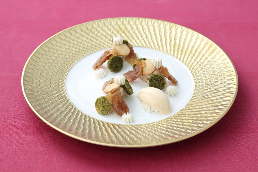 | Marron ardéchois en suprême, biscuit à la poudre d’égoma et glace Whisky Cragganmore | マロン・ナルデショワ・アン・シュプレーム、ビスキュイ・ア・ラ・プードル・デゴマ・エ・グラス・ウィスキー・クラガンモア |