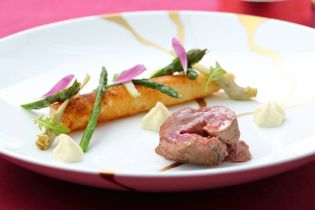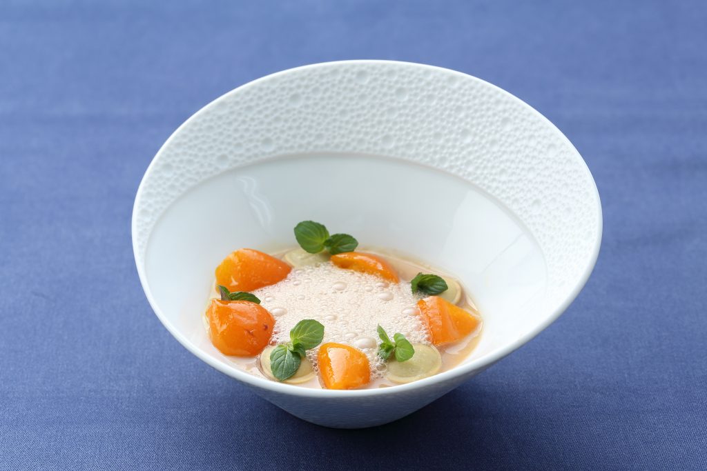 | Foie gras poché au bouillon de foin, au ravioli du Dauphiné et carottes de couleurs braisées | フォア・グラ・ポッシェ・オ・ブイヨン・ドゥ・フォワン、オ・ラヴィオリ・デュ・ドフィネ・エ・キャロット・ドゥ・クルール・ブレゼ |