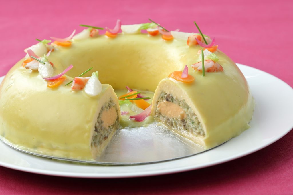 Savarin de dorade, crevette kuruma, sole et sauce au hareng fumé à la laitue