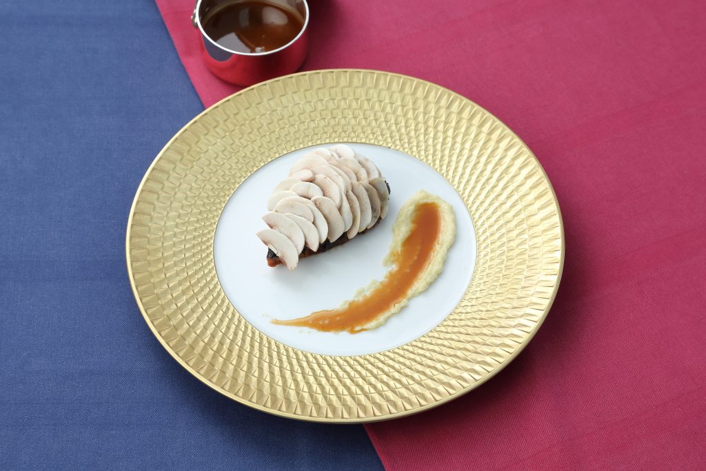| Canapé de chapon masqué de farce à gratin en écaillées de champignons de Paris et jus au sapin | カナペ・ドゥ・シャポン・マスケ・ドゥ・ファルス・ア・グラタン・アン・エカイエ・ドゥ・シャンピニオン・ドゥ・パリ・エ・ジュ・オ・サパン |
