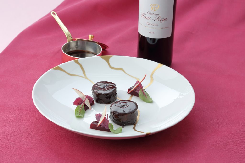| Filet de boeuf à la ficelle, gratin de crozets au Reblochon et sauce Robert | フィレ・ドゥ・ブッフ・ア・ラ・フィセル、グラタン・ドゥ・クロゼ・オ・ルブロション・エ・ソース・ロベール |