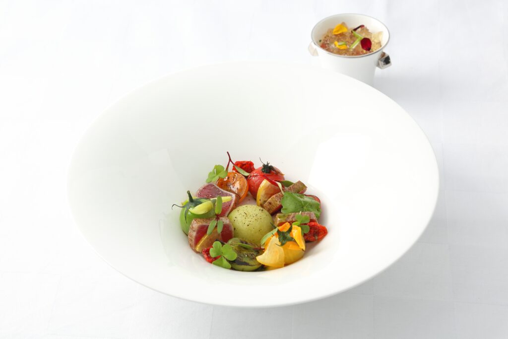 | Artichaut violet Moelleux et fondant, dans l’esprit d’une ratatouille Consommé de crevettes grises infusé à l’agastache (E) | アルティショ・ヴィオレ モエルー・エ・フォンダン、 ダン・レスプリ・デュンヌ・ラタトゥイユ コンソメ・ドゥ・クルヴェット・グリーズ・アンフュゼ・ア・ラガスタシュ |