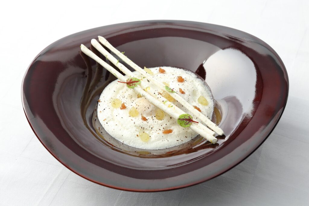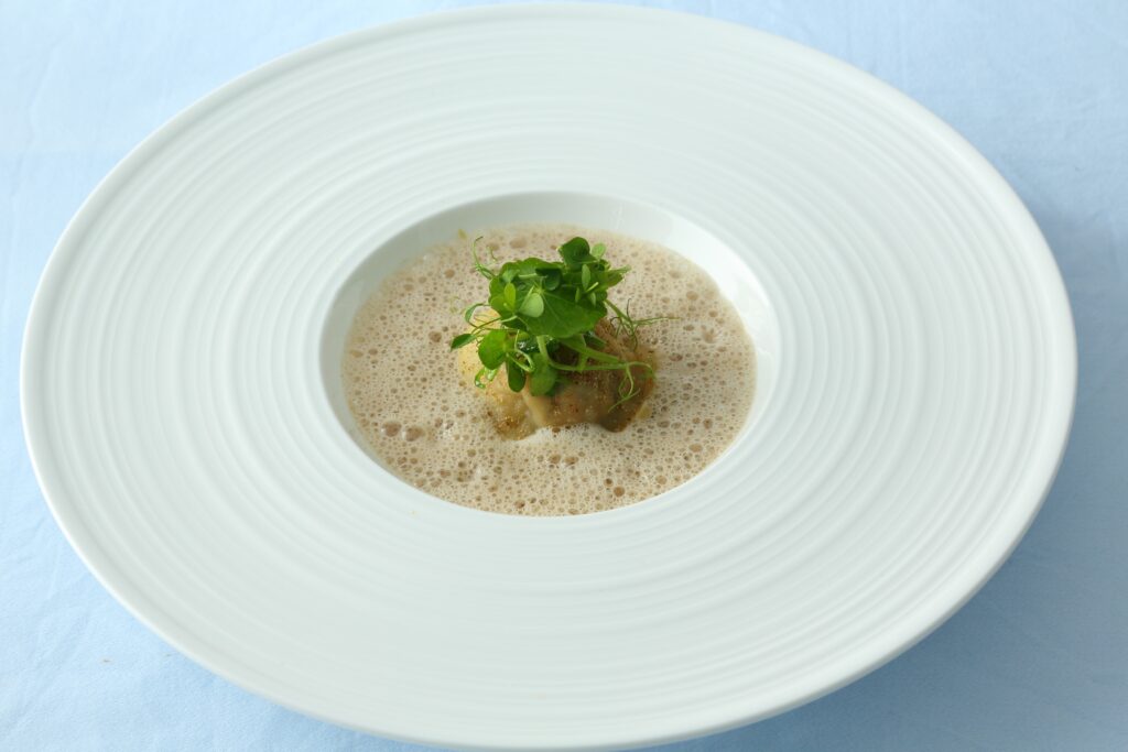| Champignons des bois En raviole et noisettes croquantes. Crémeux de jaune d’œuf et émulsion de cèpes secs (E) | シャンピニョン・デ・ボワ アン・ラヴィオル・ノワゼット・クロカント クレムー・ドゥ・ジョーヌ・ドゥフ・エ・エミュルジョン・ドゥ・セップ・セック |