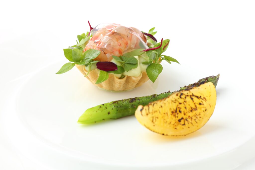 | Ecrevisses du Lac de Grand Lieu En fine tartelette à l’asperge verte Main de Bouddha et jus de carapaces à l’huile de basilic (E) | エクルヴィス・デュ・ラック・ドゥ・グラン・リュ アン・フィヌ・タルトレット・ア・ラスペルジュ・ヴェルト マン・ドゥ・ブッタ・エ・ジュ・ドゥ・カラパス・ア・リュイル・ドゥ・バジリック |