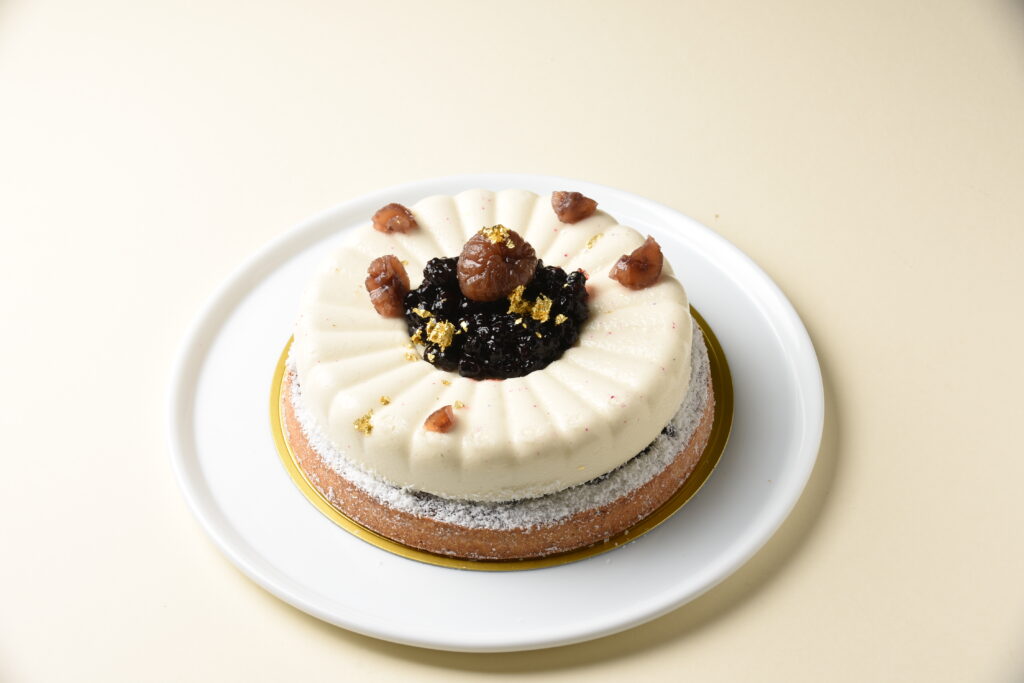 | Tarte marron : pâte sablée, crème marron, confit myrtille , mousse panacotta(T) | タルト・マロン:パート・サブレ、クレーム・マロン、コンフィ・ミルティーユ、ムース・パンナコッタ |