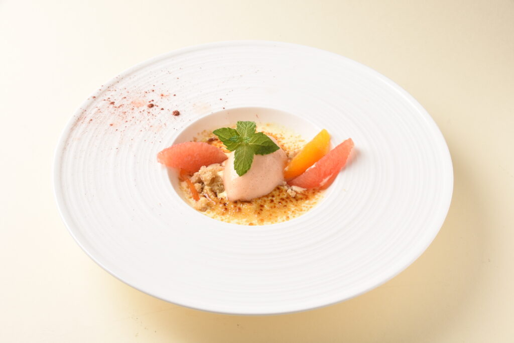 | Agar orange sanguine, crème brûler, sablé fleur de sel, sorbet vanille et pamplemousse(D) | アガー・オランジュ・サンギーヌ、クレームブリュレ、サブレ・フルール・ド・セル、ソルベ・ヴァニーユ・エ・パンプルムース |