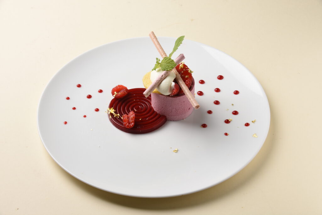 | Meringue framboise, biscuit amande, crémeux menthe, chantilly mascarpone(D) | ムラング・フランボワーズ、ビスキュイ・アマンド・クレムーモント、シャンティイ・マスカルポーネ |